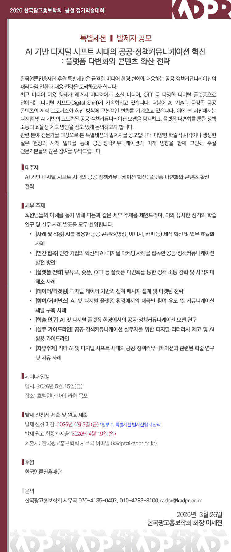 [KADPR] 2026 봄철 정기학술대회 특별세션 Ⅲ 발제자 공모(AI 기반 디지털 시프트 시대의 공공·정책커뮤니케이션 혁신: 플랫폼 다변화와 콘텐츠 확산 전략)