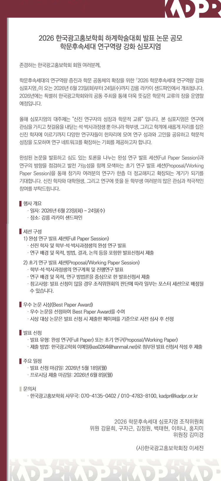 [KADPR]2026 한국광고홍보학회 하계학술대회 발표 논문 공모 학문후속세대 연구역량 강화 심포지엄