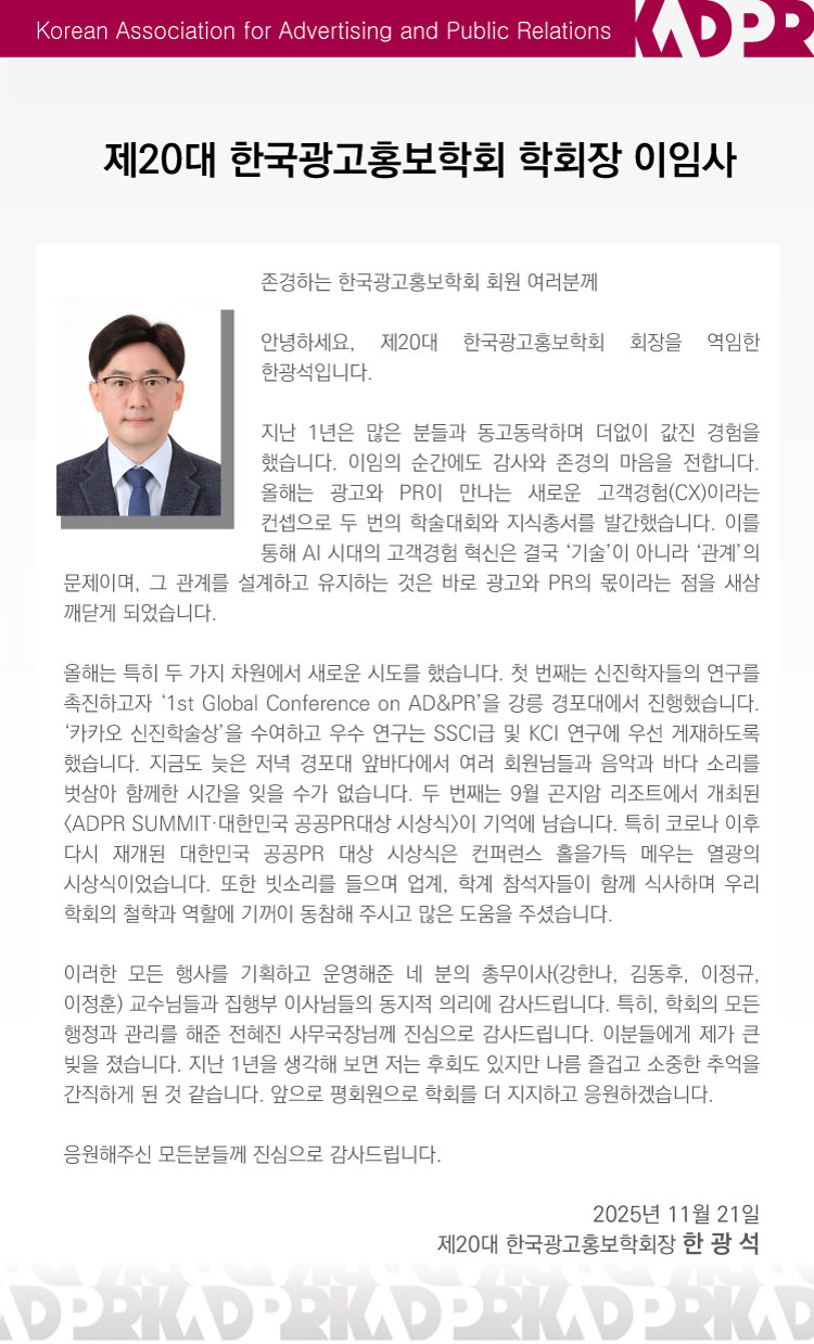[KADPR]제21대 한국광고홍보학회 학회장 취임사