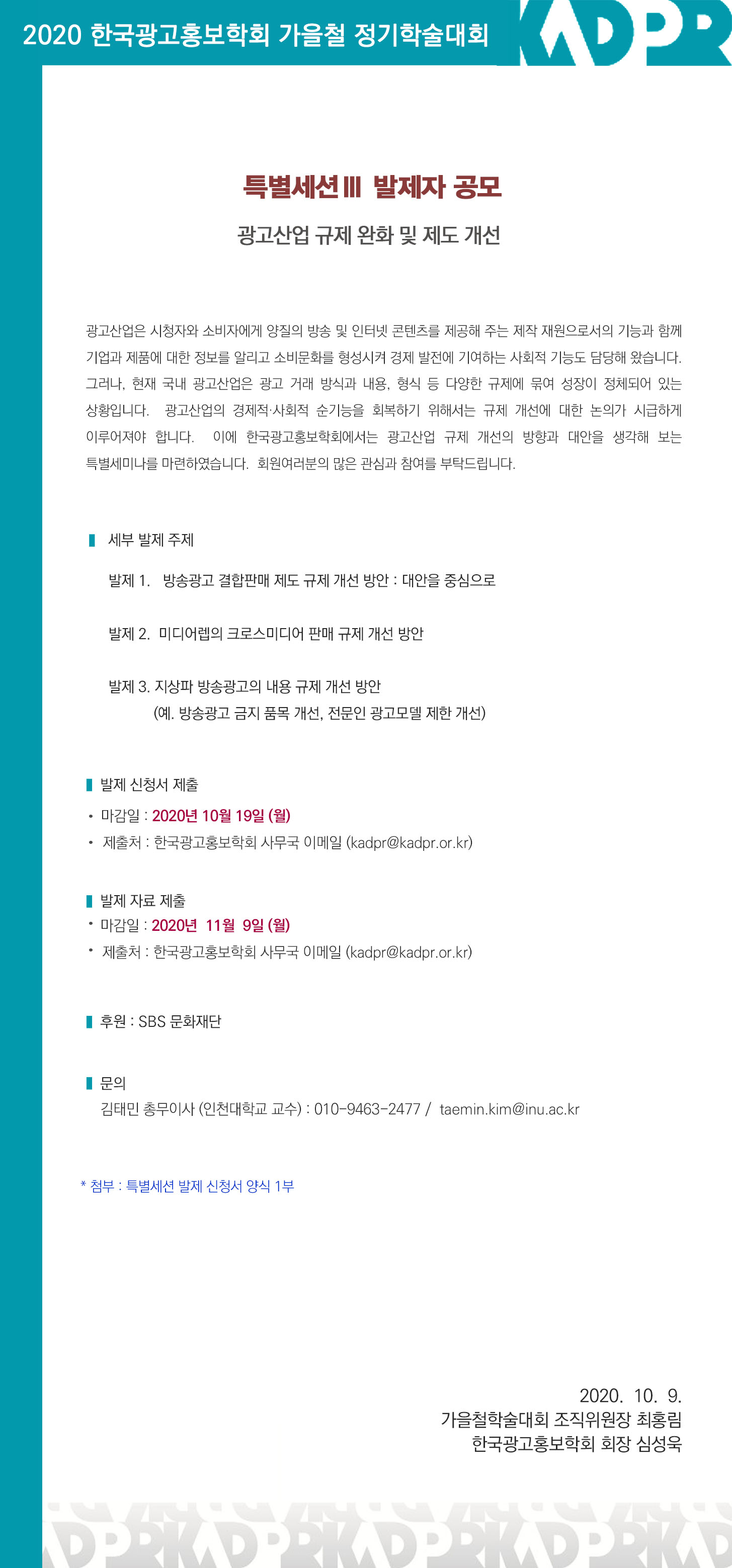[KADPR] 2020 가을철 정기학술대회 특별세션Ⅲ 발제자 공모 [광고산업 규제 완화 및 제도 개선]