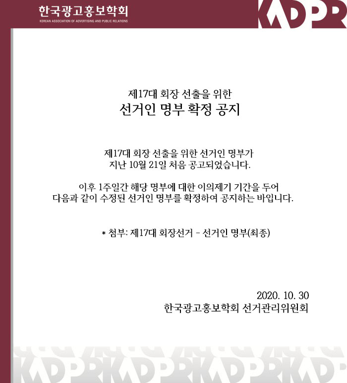 [KADPR] 제17대 회장 선출을 위한 선거인 명부 확정 공지