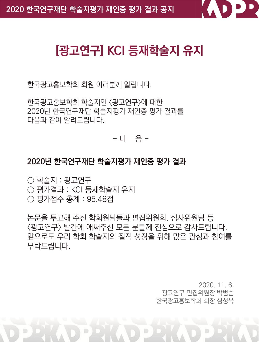 [KADPR] 2020 한국연구재단 학술지 평가 재인증 평가 결과 공지