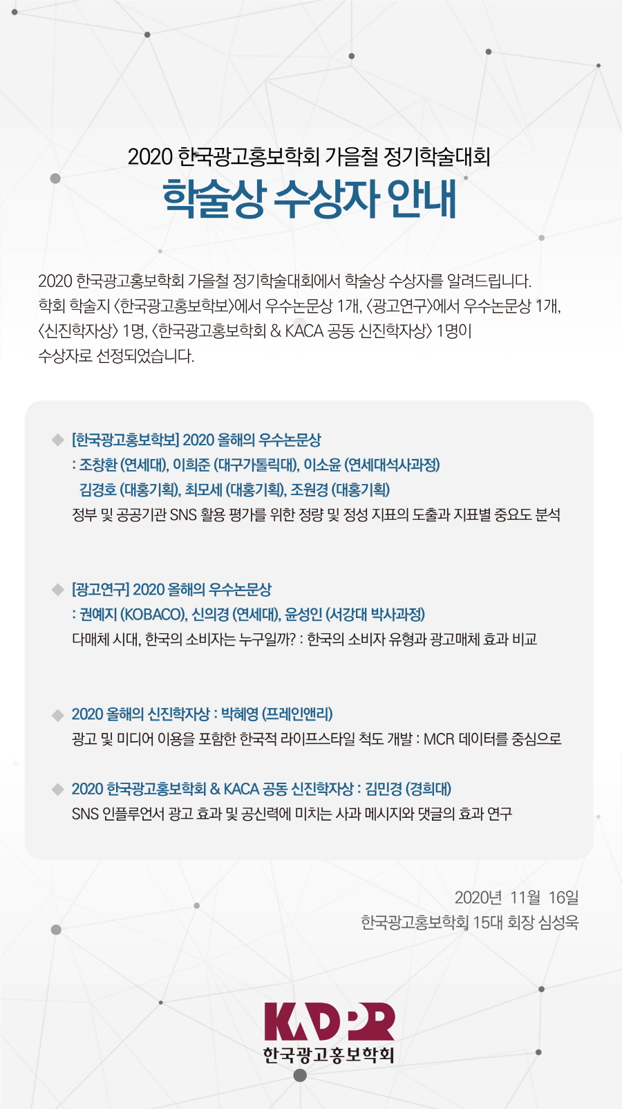 [KADPR] 20 가을철 정기학술 대회 학술상 수상자 안내
