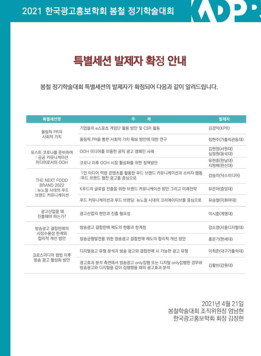 [KADPR] 2021 봄철학술대회 특별세션 발제자 확정 공고