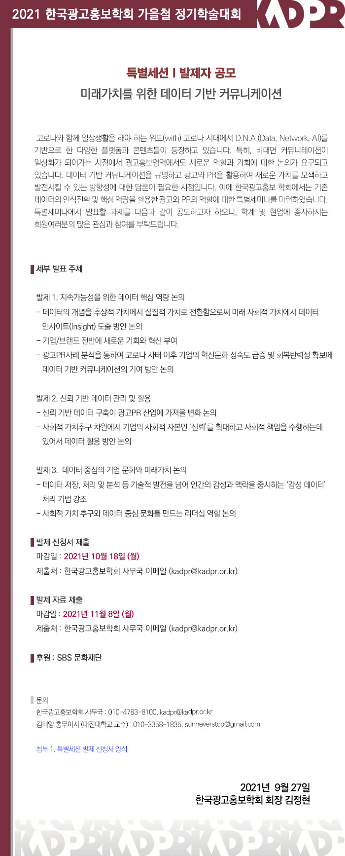 [KADPR] 2021 가을철학술대회 특별세션 I 발제자 공모 (미래가치를 위한 데이터 기반 커뮤니케이션)