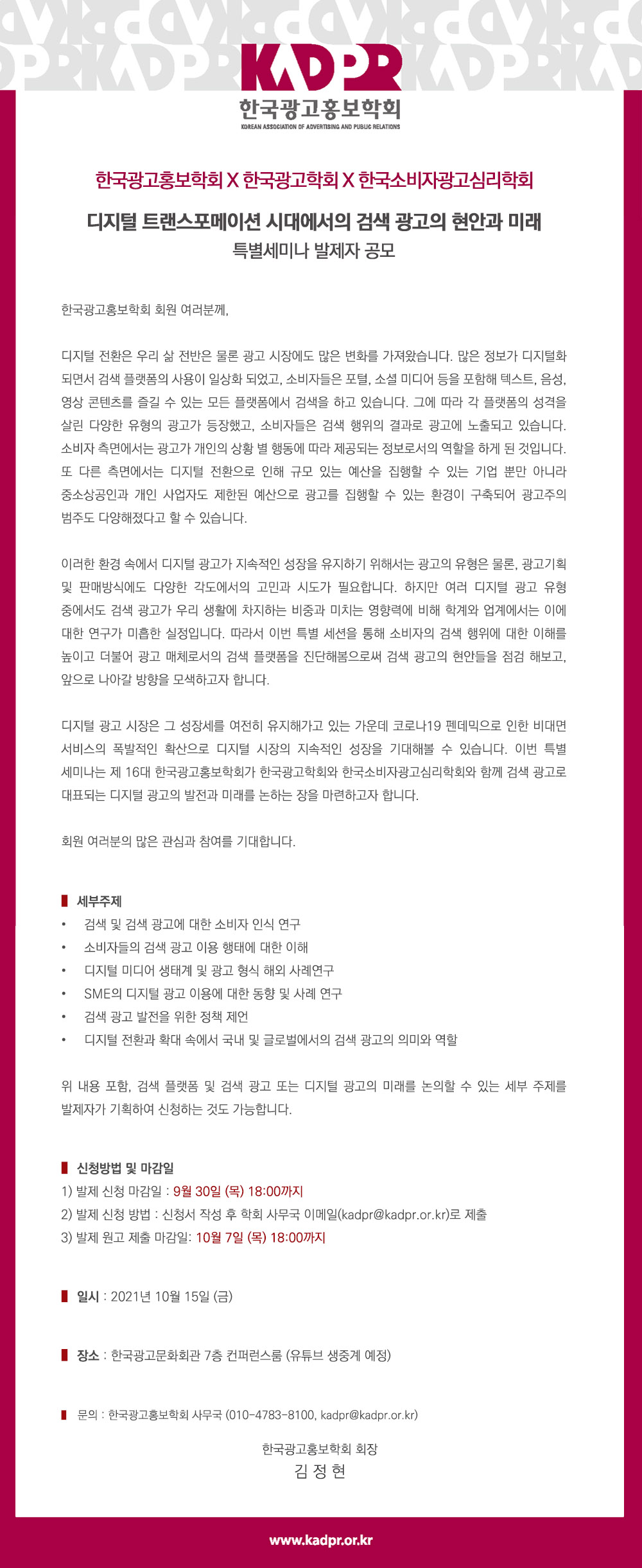 [KADPR] 디지털 트랜스포메이션 시대에서의 검색 광고의 현안과 미래 특별세미나 발제자 확정 공고