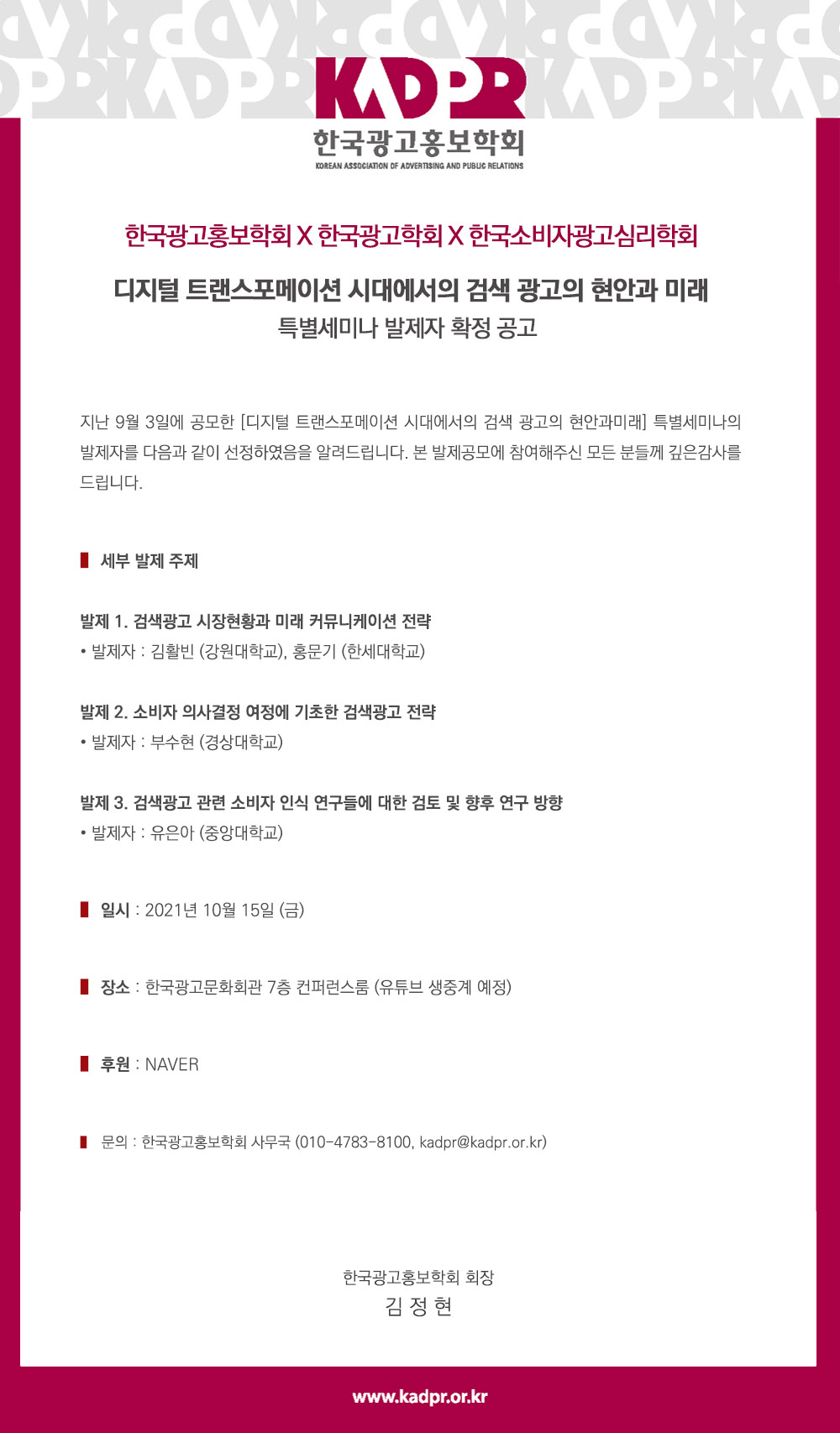 [KADPR] 디지털 트랜스포메이션 시대에서의 검색 광고의 현안과 미래 특별세미나 발제자 확정 공고