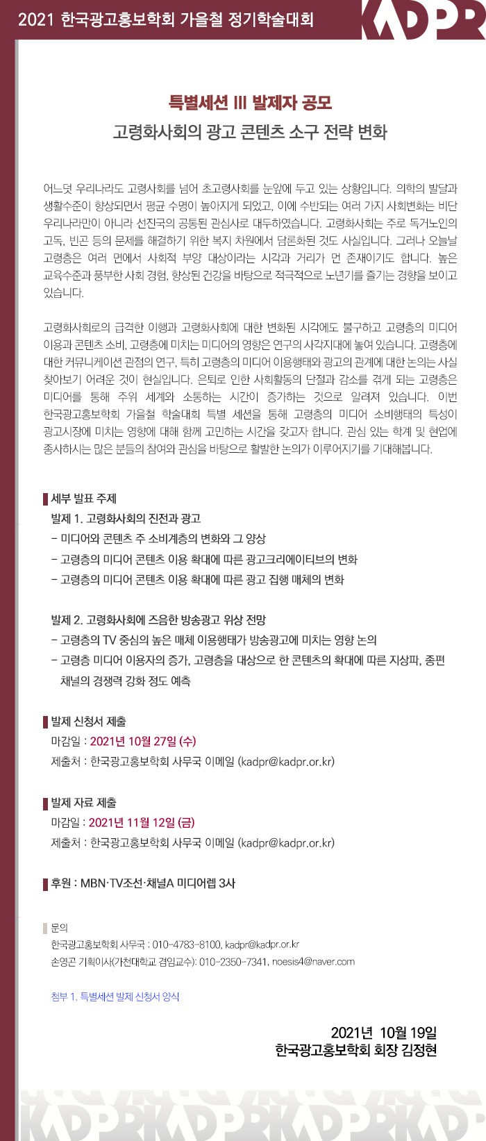 [KADPR] 2021 가을철학술대회 특별세션 III 발제자 공모 (고령사회의 광고 콘텐츠 소구 전략 변화)