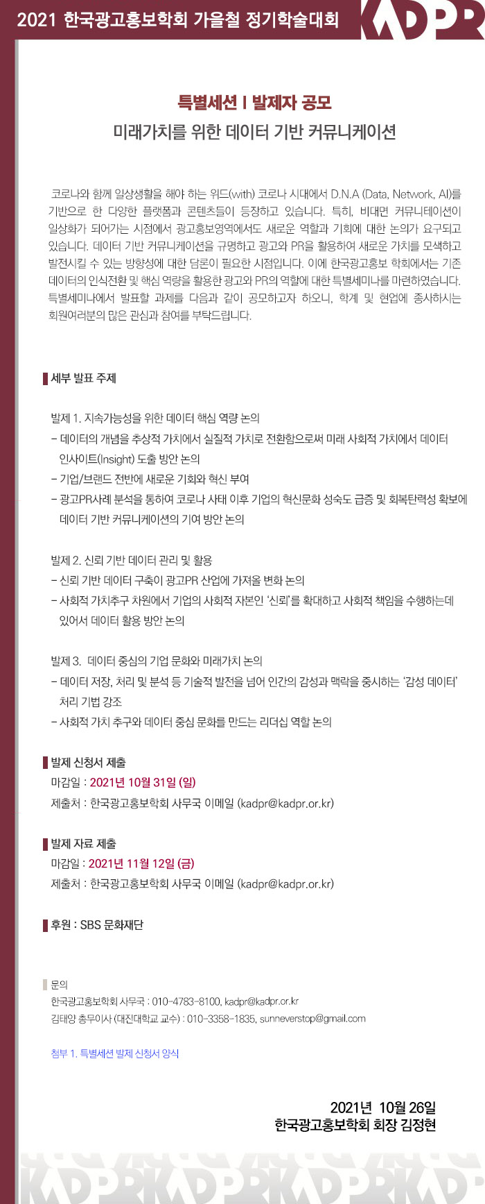 [KADPR] 2021 가을철학술대회 특별세션 I 발제자 공모 연장 (미래가치를 위한 데이터 기반 커뮤니케이션)