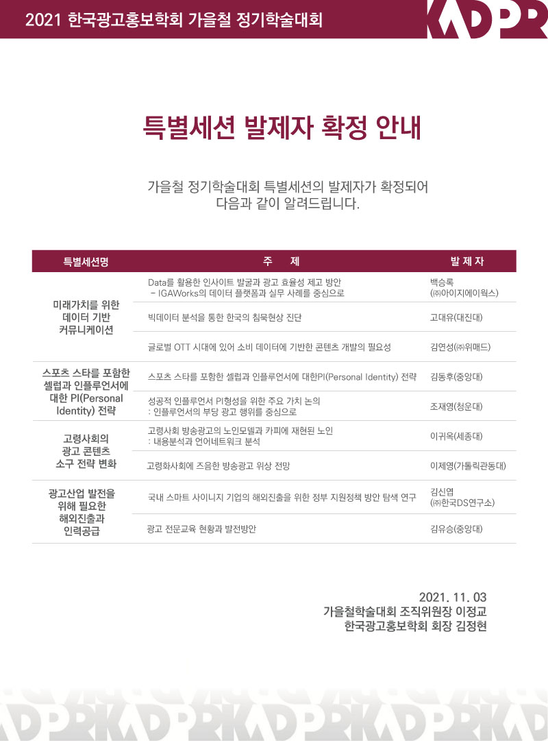 [KADPR] 2021가을철 정기학술대회 특별세션 발제자 확정 안내