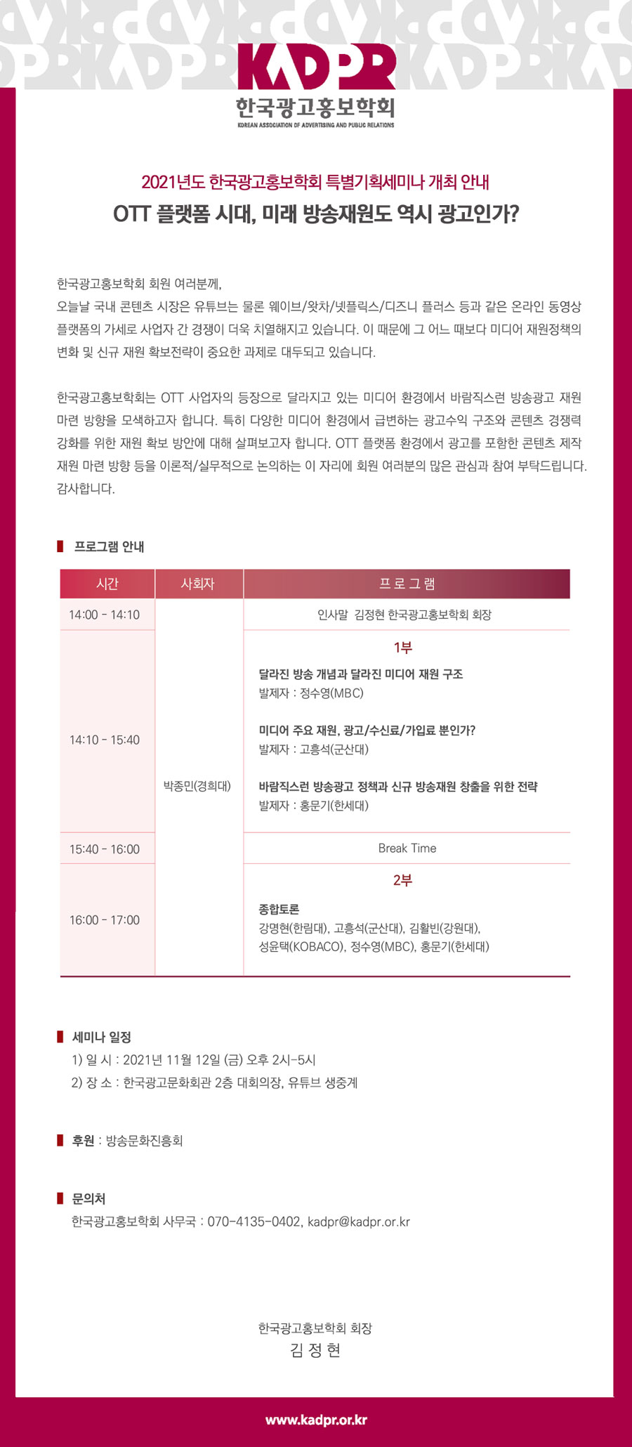 [KADPR] OTT 플랫폼 시대, 미래 방송재원도 역시 광고인가? 특별세미나 개최안내
