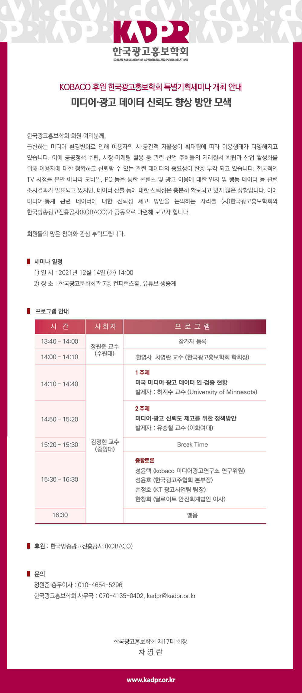 [KADPR]'미디어,광고 데이터 신뢰도 향상 방안 모색' 특별세미나 개최 안내(12.14)