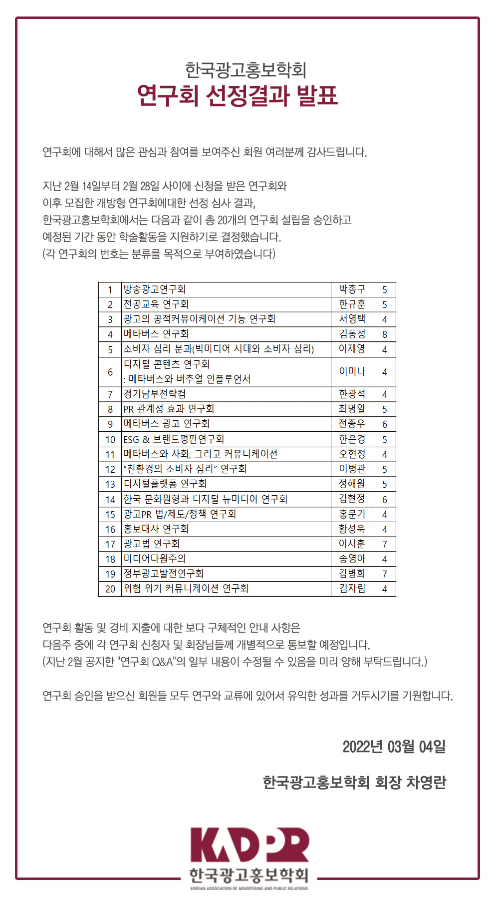 [KADPR] 2022년 연구회 선정결과 발표