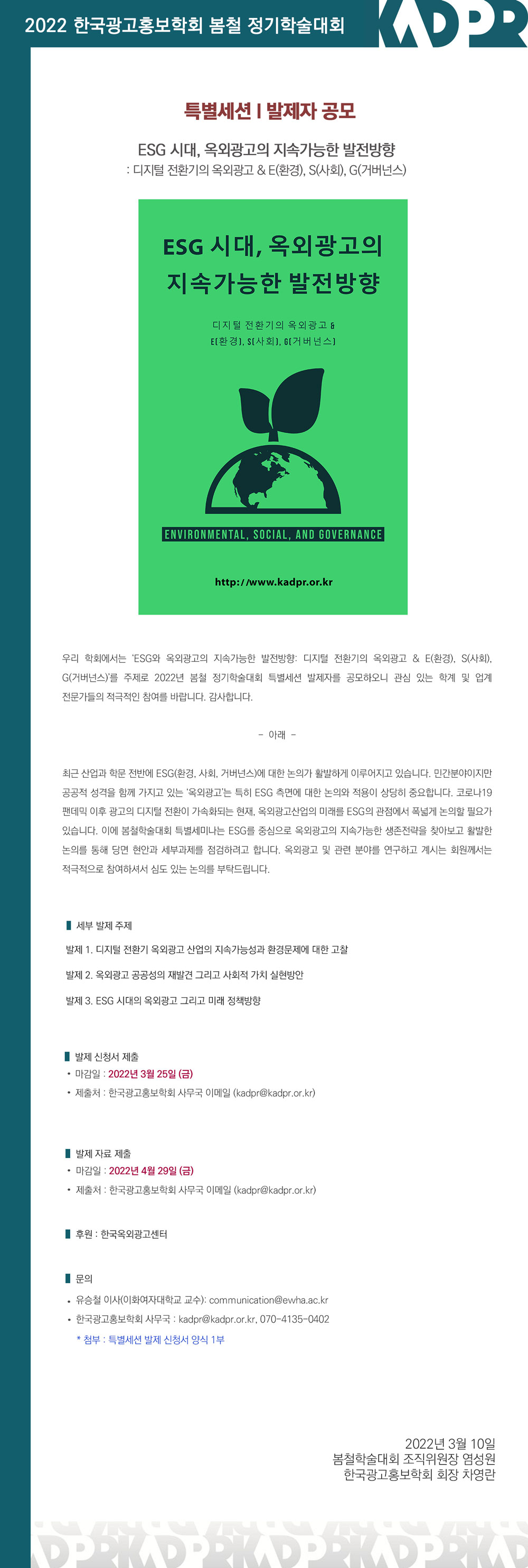 [KADPR] 2022 봄철학술대회 특별세션 I 발제자 공모 (ESG 시대, 옥외광고의 지속가능한 발전방향)
