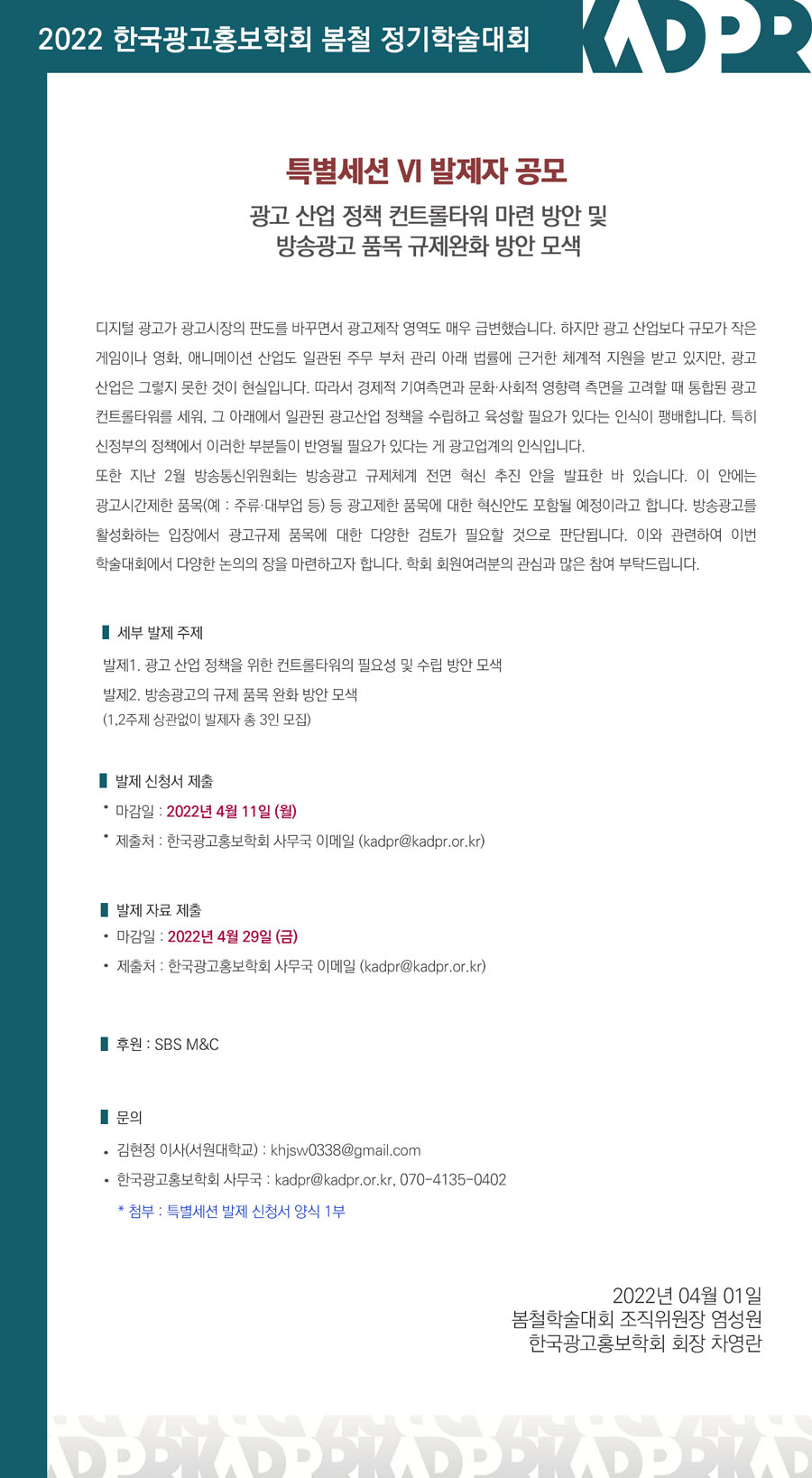 [KADPR] 2022 봄철학술대회 특별세션 VI 발제자 공모 (광고 산업 정책 컨트롤타워 마련 방안 방송광고 품목 규제완화 방안 모색)