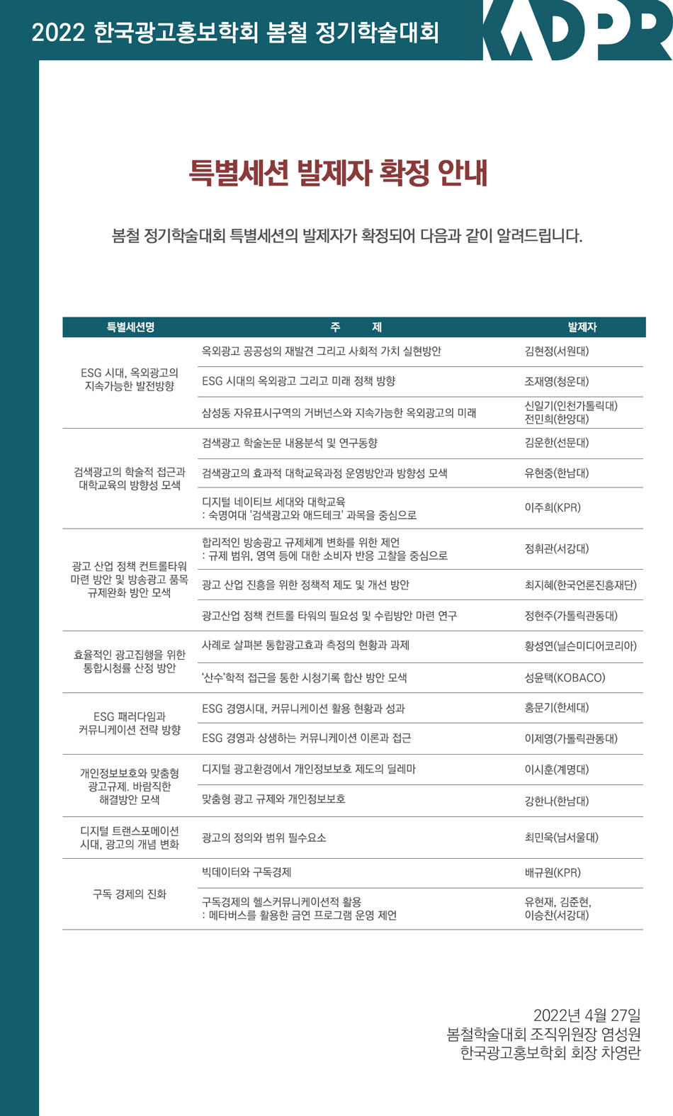 [KADPR] 2022 봄철 정기학술대회 특별세션 발제자 확정 공지